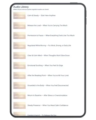 When you access Nervous System Reset, you're not just getting audio tracks — you're getting a complete nervous system support toolkit. From calming regulation sessions to trust-building transparency, you’ll have everything you need to feel safe, grounded, and in control — on your terms.