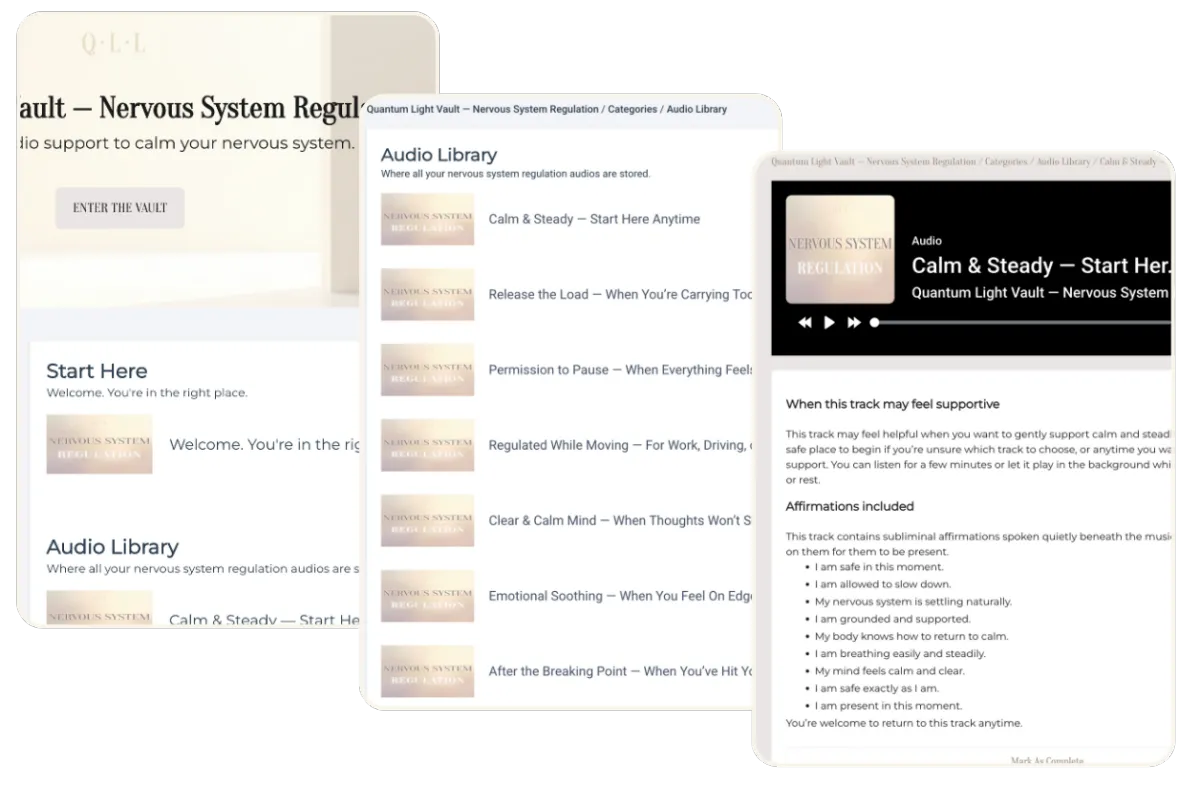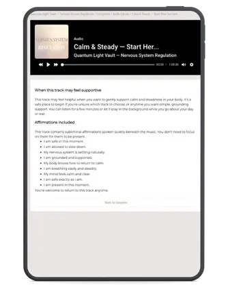 The Quantum Light Vault is a curated audio library designed to support nervous system regulation through calming sound and subliminal affirmations.